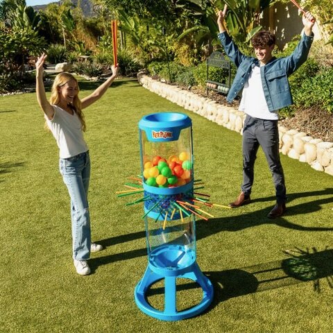 Players take turns carefully pulling out giant sticks from the frame without letting the balls drop. The person who causes the fewest balls to fall wins. It’s simple, fast-paced, and keeps everyone laughing and cheering.